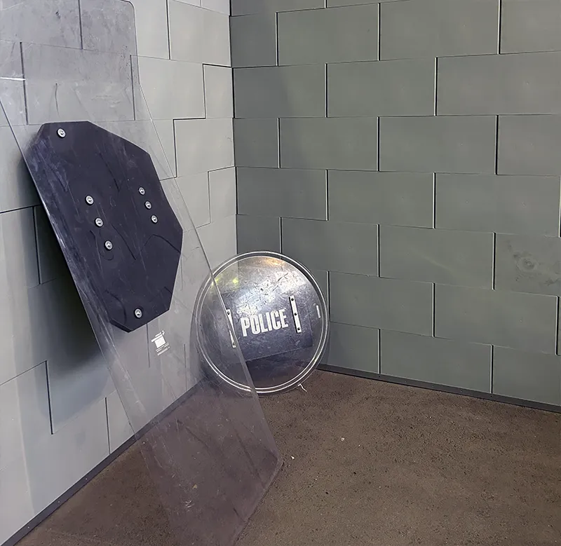 A compact, reinforced training room for police, SWAT and counter-terror teams to practise containment, restraint and casualty removal under realistic pressure. It is constructed with rubber infill blocks and a steel upright framework for impact resistance, fitted with a single doorway with an integrated MoE door and instructor viewing panels for oversight and recording. Included in the kit is foam panelling on the internal side of the structure to allow for a safe training environment.